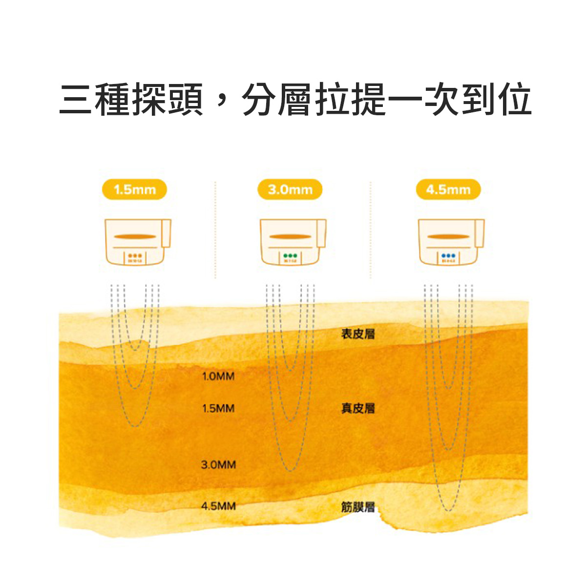 其中最深的 4.5mm 探頭,能直達 SMAS 筋膜層(外科拉皮時會處理的層次),有效刺激深層支撐結構收縮與膠原蛋白新生,帶來由內而外的拉提效果。更重要的是,這一切過程皆在不傷害表皮的前提下進行,因此療程安全性極高。