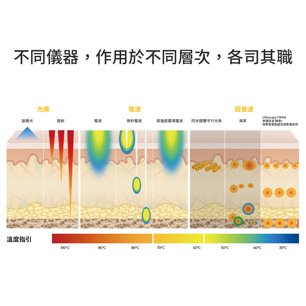 Ultherapy PRIME 美國音波極透+ 擁有三種不同深度的探頭,可對應不同肌膚層次,達到分層治療、逐層緊緻的效果。