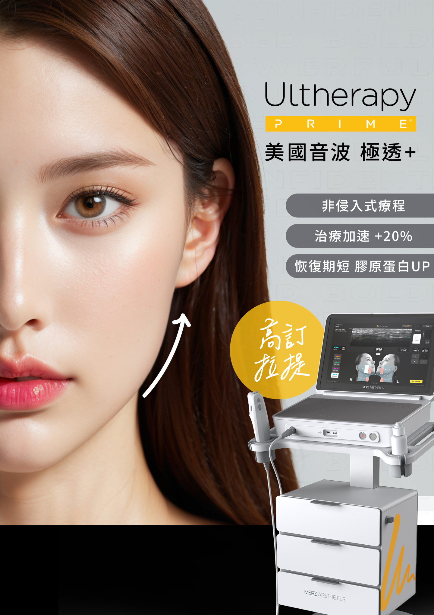 Ultherapy PRIME 以高效且安全的能量輸出,幫助肌膚由內而外重啟膠原蛋白新生,帶來自然、緊緻、立體的年輕輪廓。